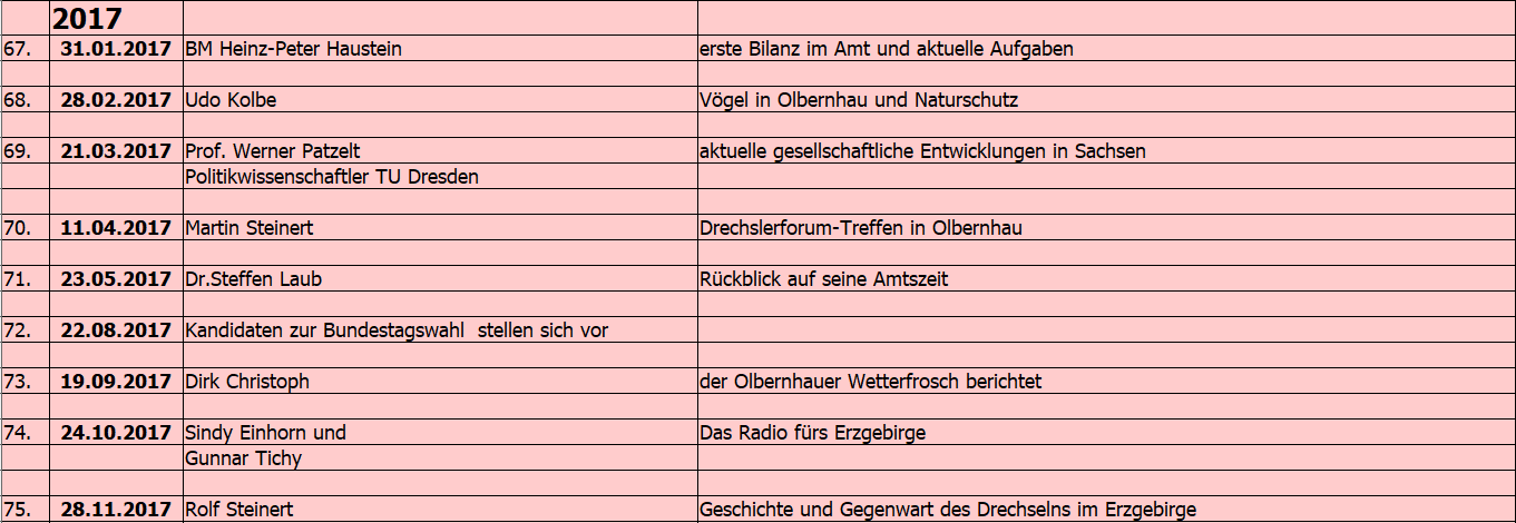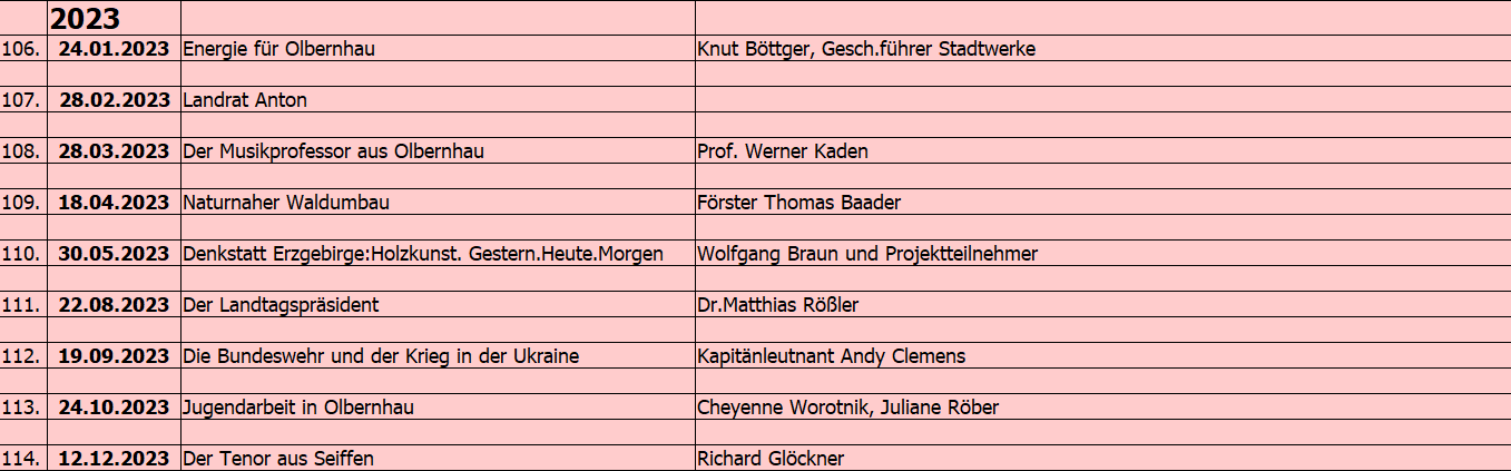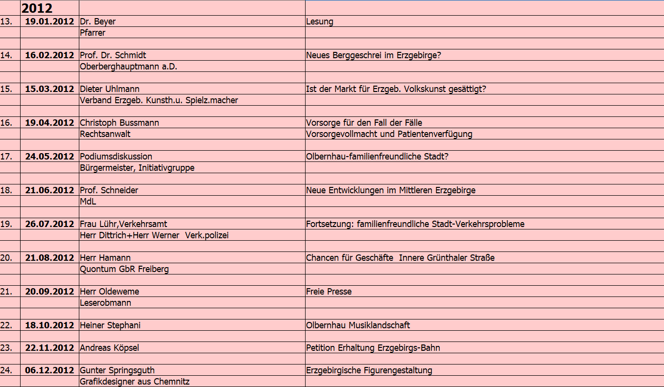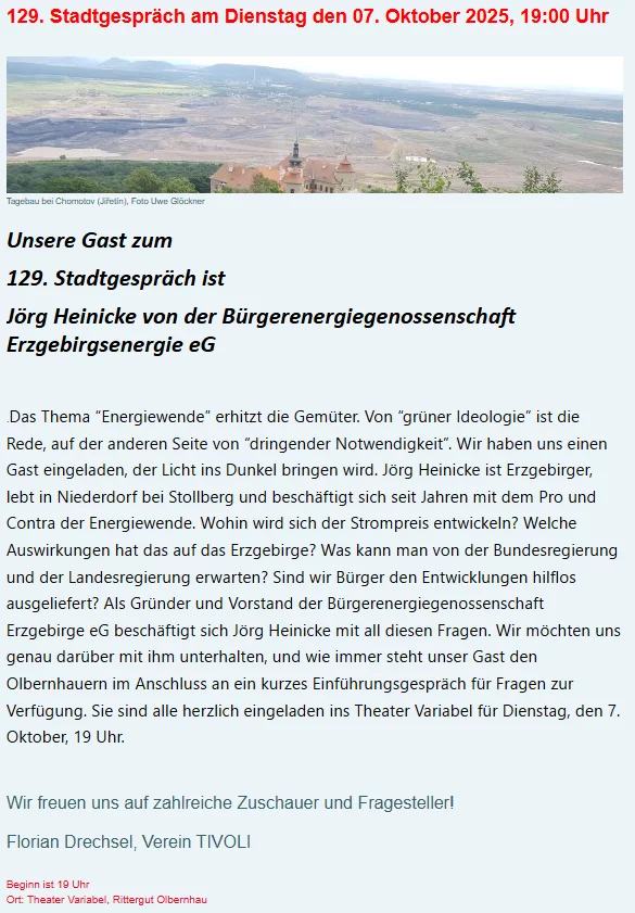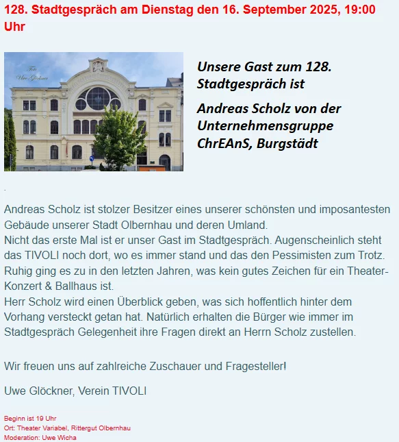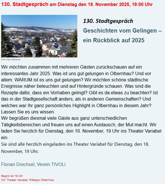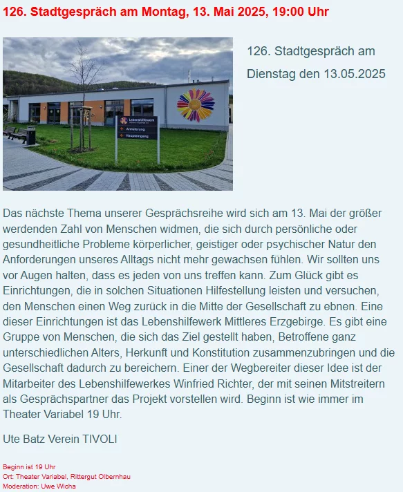 Hier finden Sie eine Auflistung aller bisher vom Tivoli e.V. Olbernhau veranstalteten Stadtgespräche. Da kommt einiges zusammen, nicht nur an Menge sondern ganz besonders an Vielfalt der Themen, immer im offenen Dialog mit allen Beteiligten.