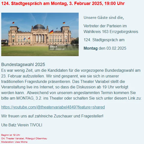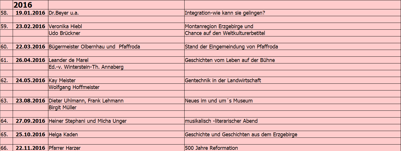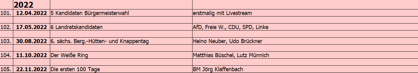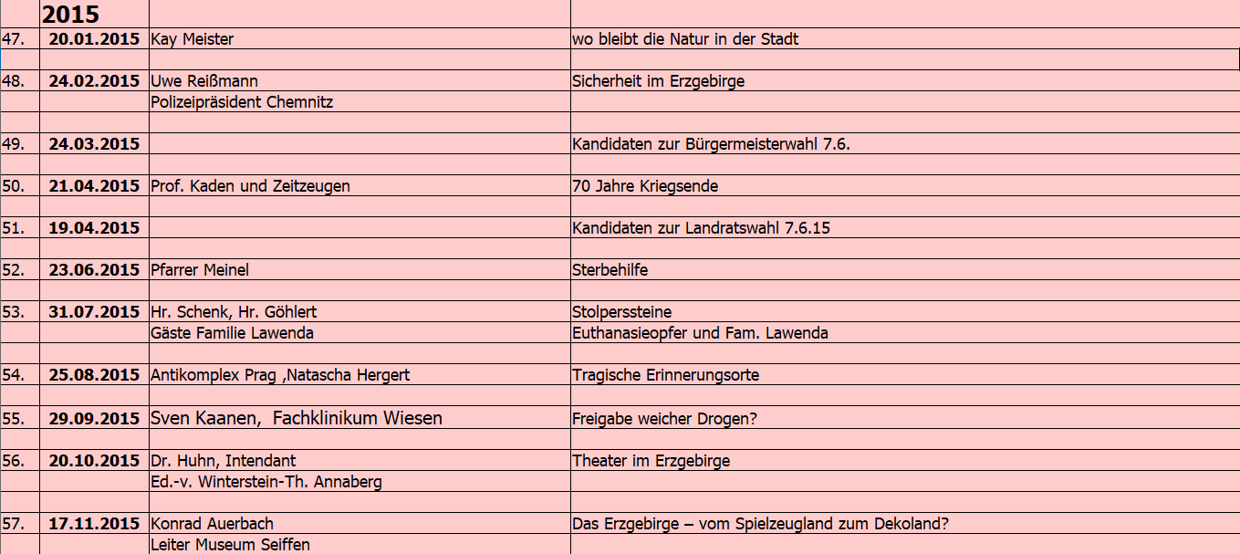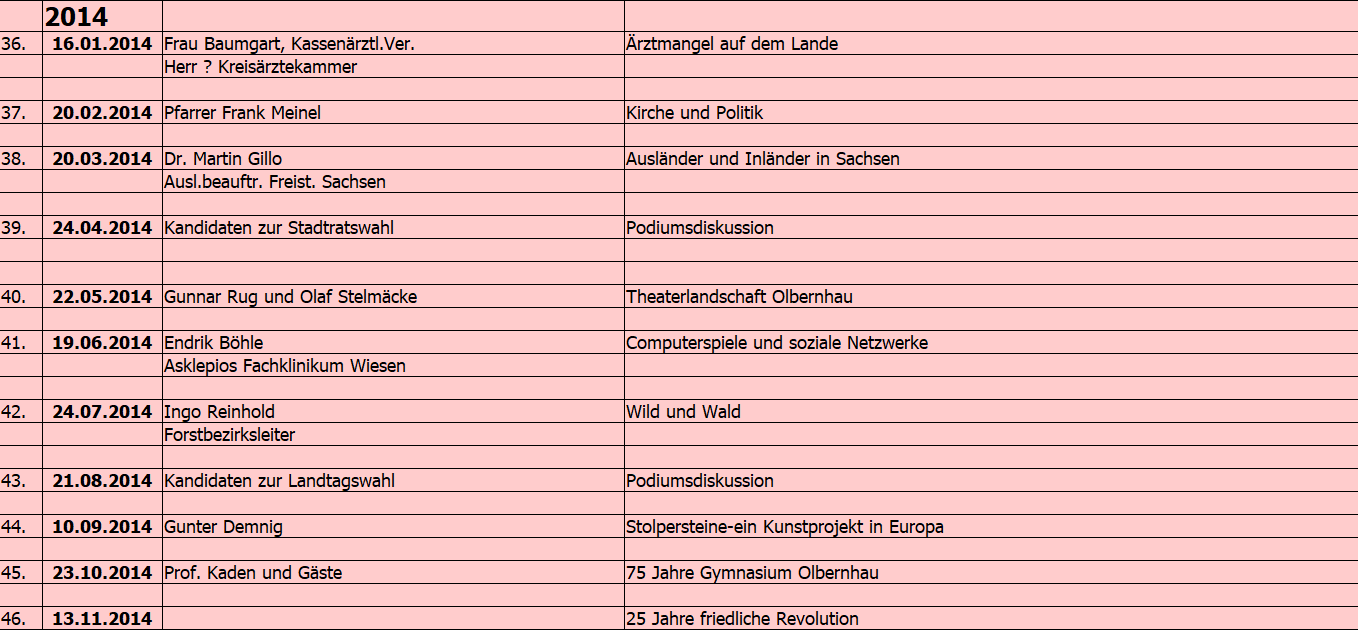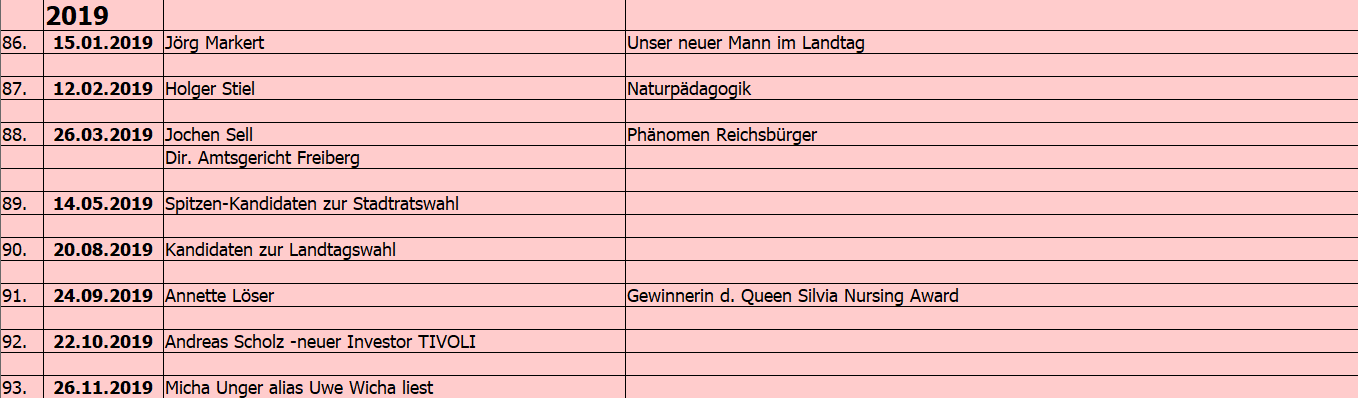 Hier finden Sie eine Auflistung aller bisher vom Tivoli e.V. Olbernhau veranstalteten Stadtgespräche. Da kommt einiges zusammen, nicht nur an Menge sondern ganz besonders an Vielfalt der Themen, immer im offenen Dialog mit allen Beteiligten.